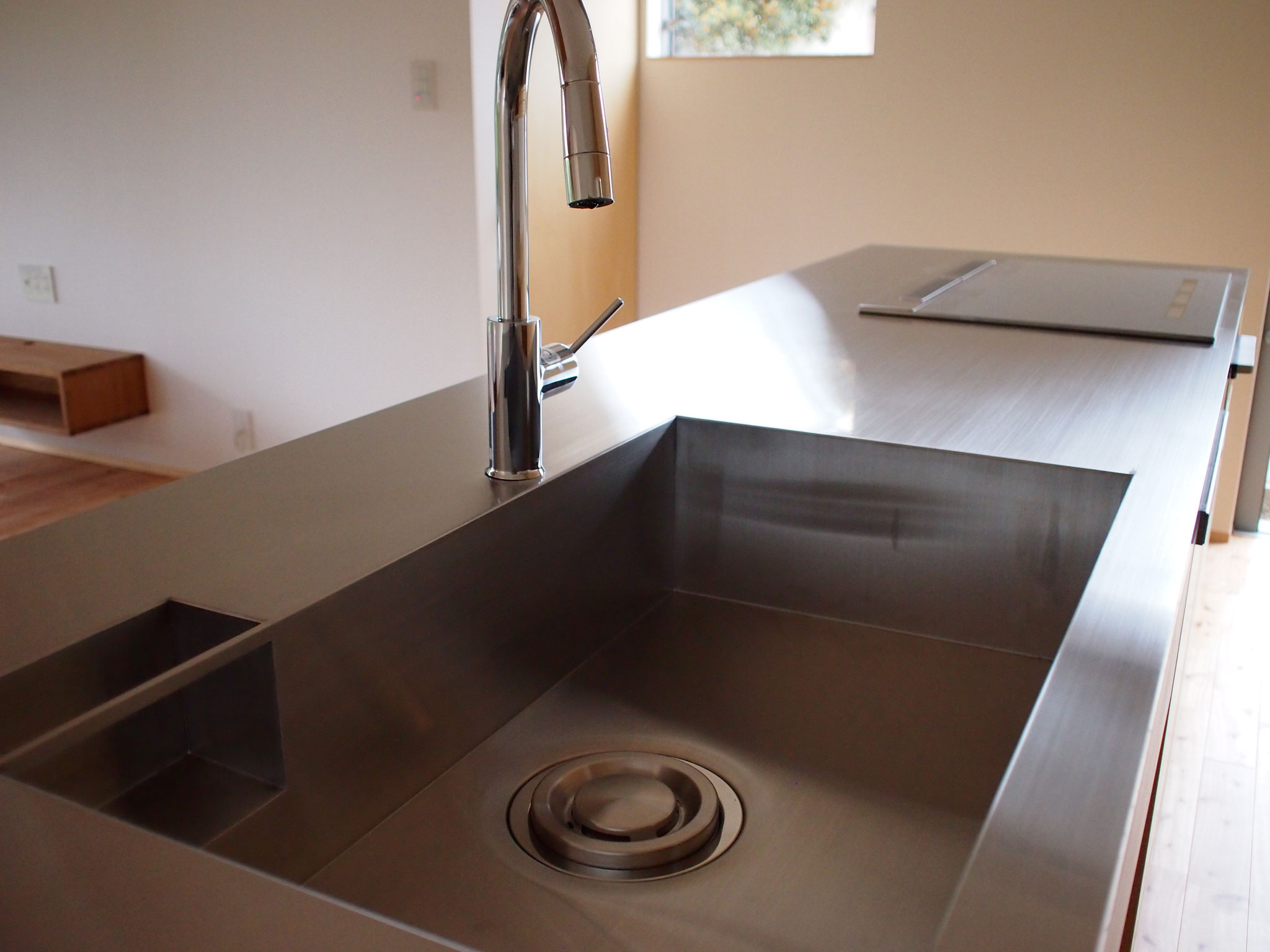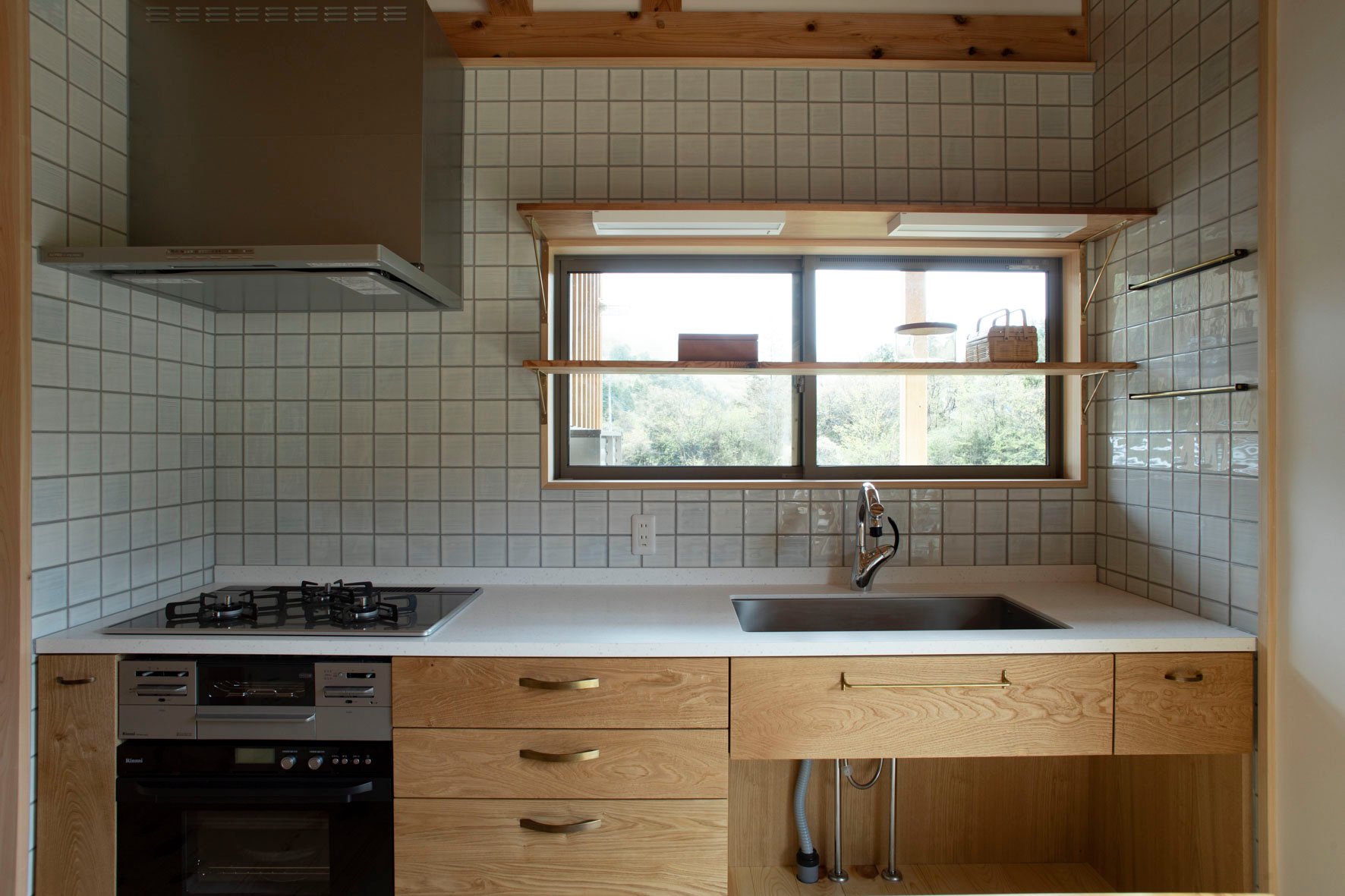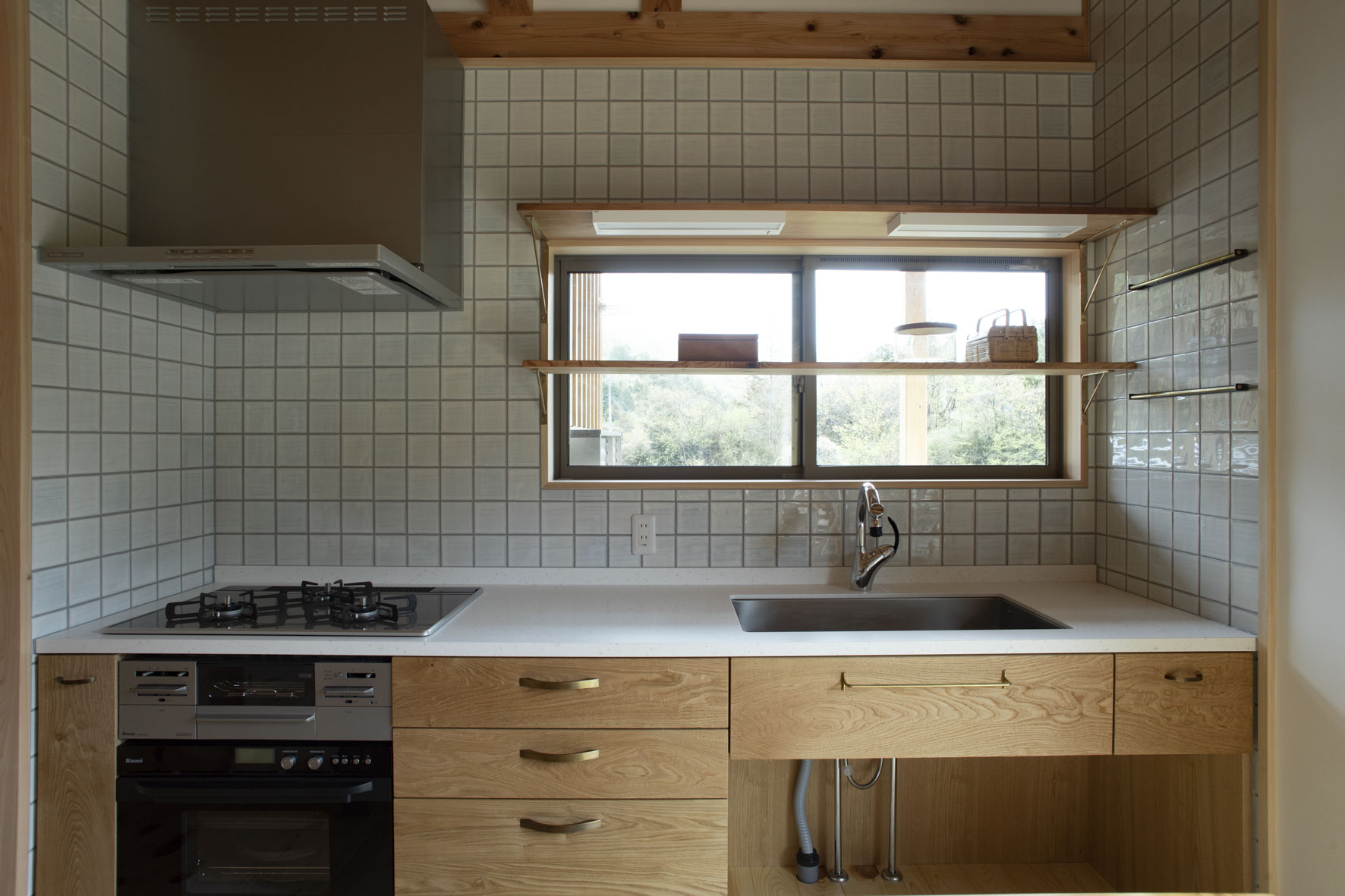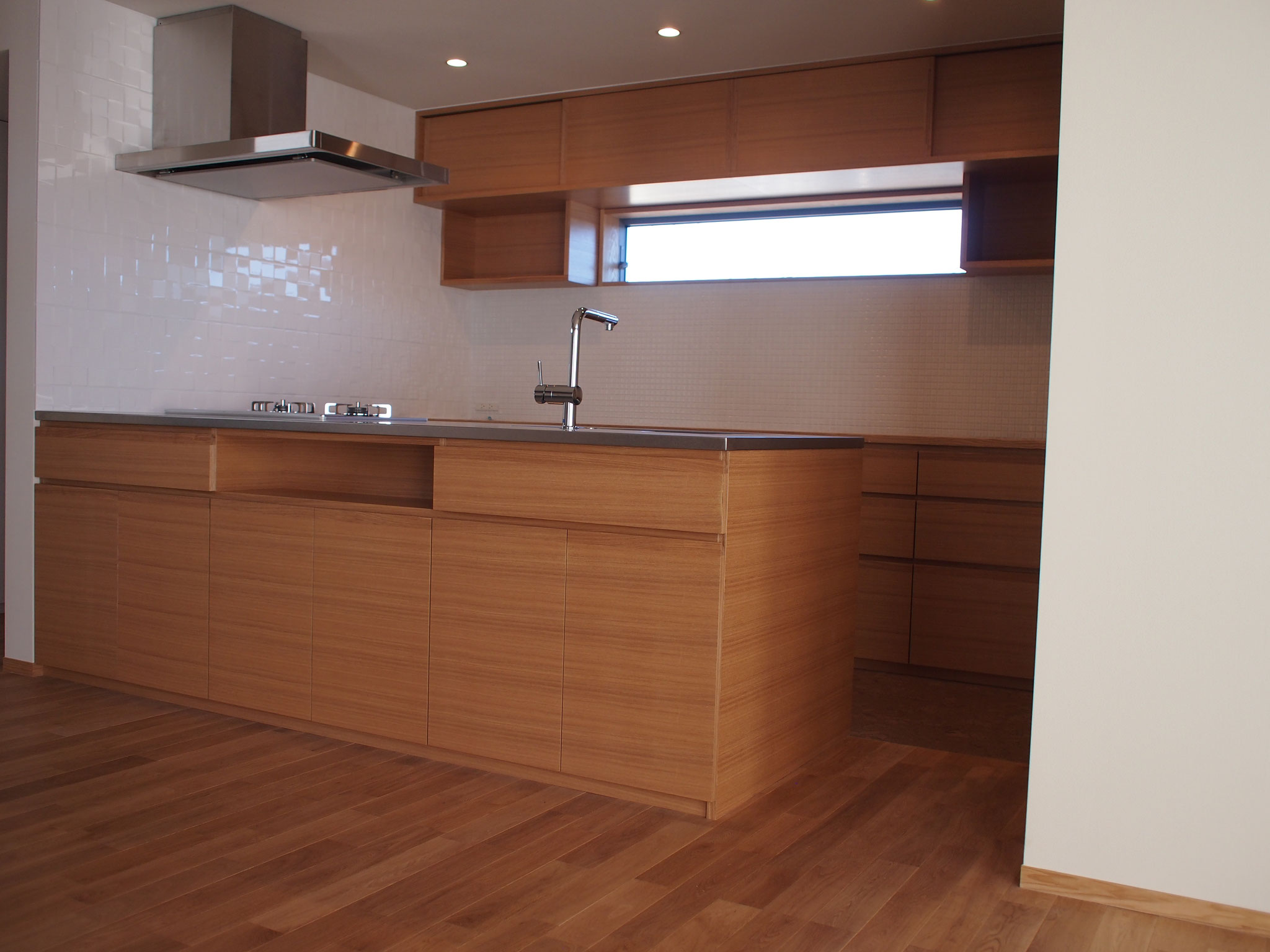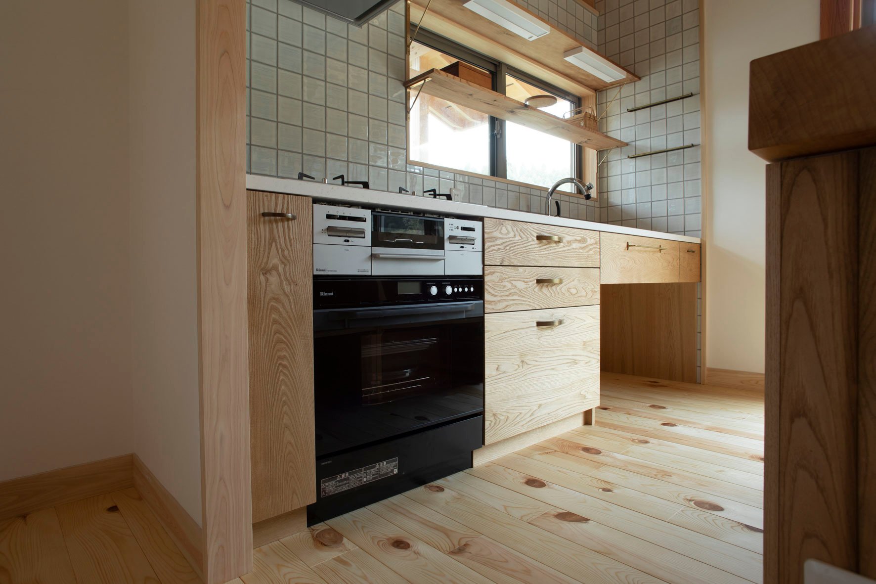 引出の前板のみ栗の無垢材とし本体は、栗材の突板の仕様製作いたしました。ガスレンジとオーブンの一体型をはめ込みしました。