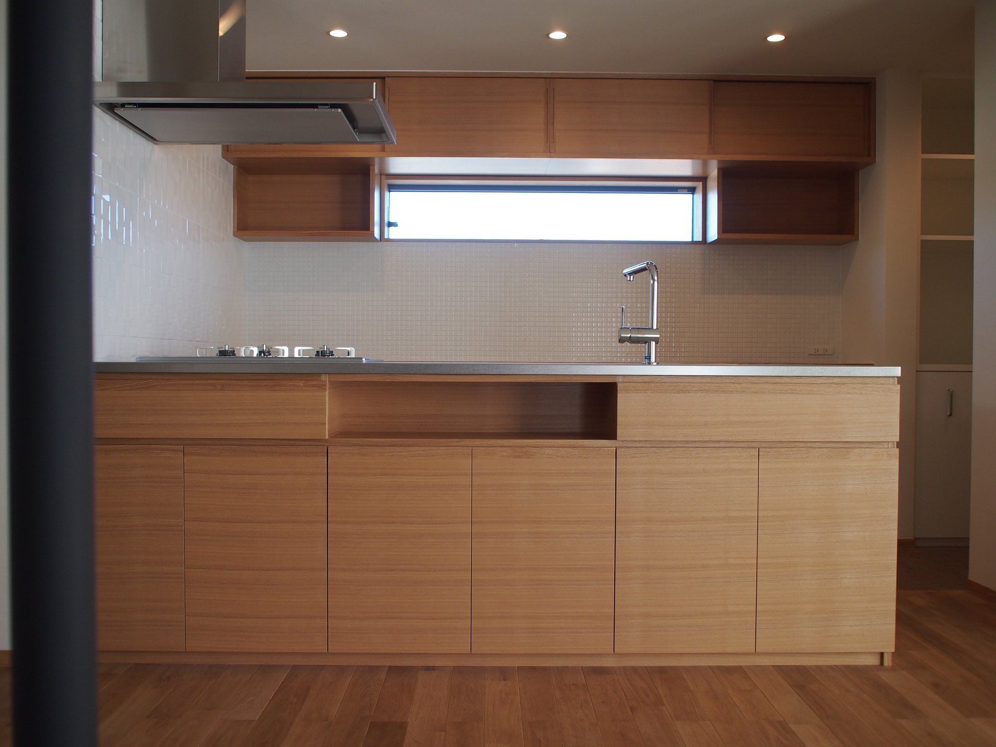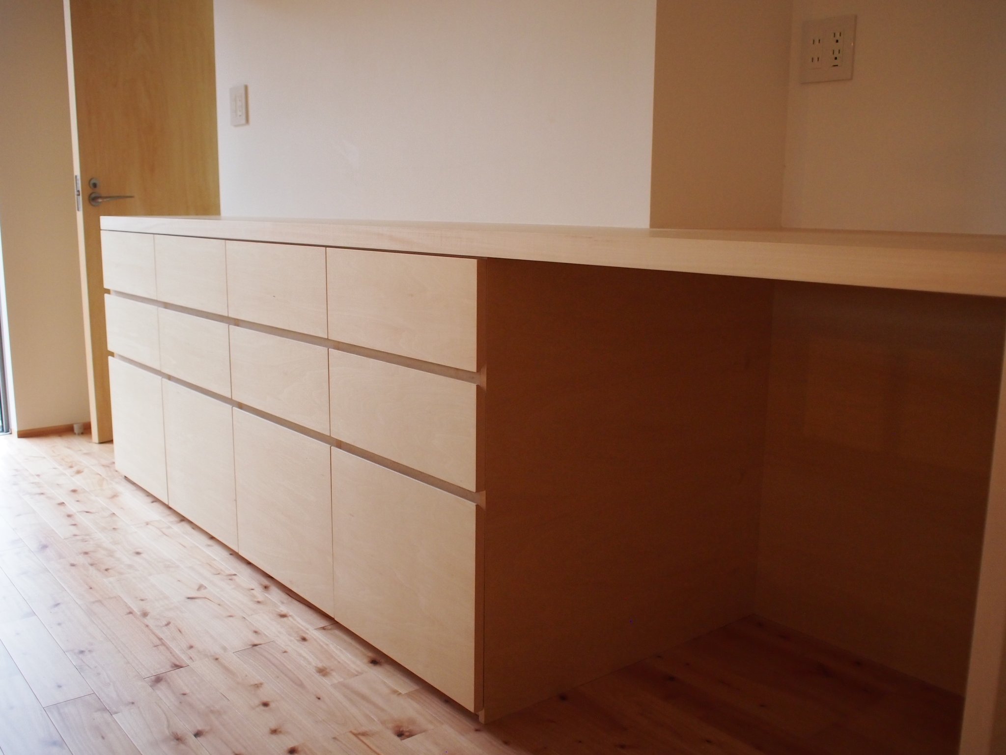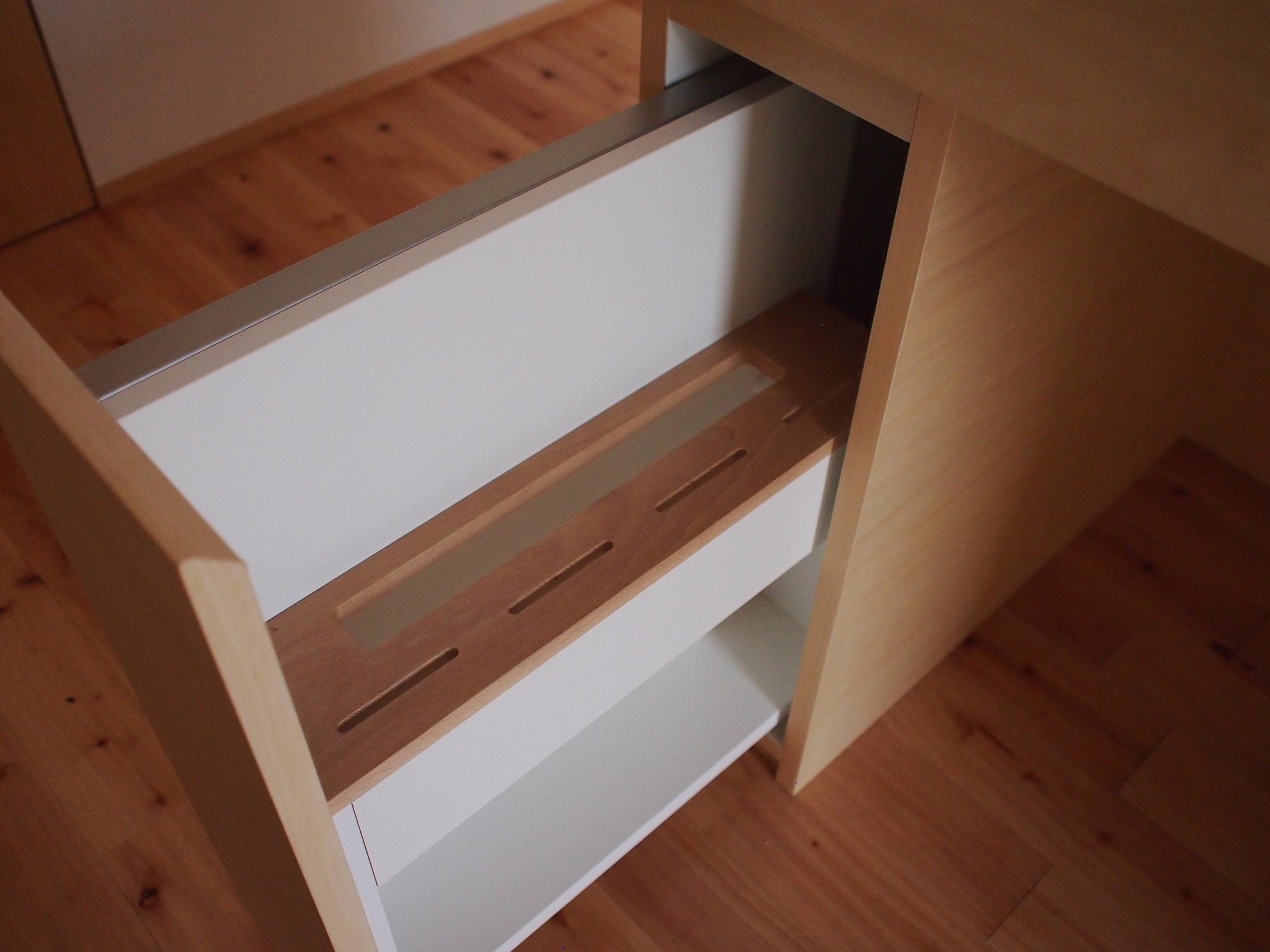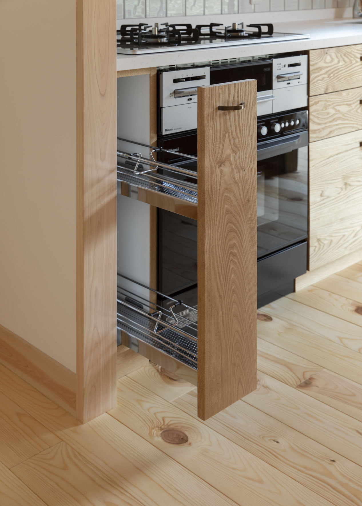 シナベニヤのシンプルな装いに合わせハンドルをつけない構造。包丁ケースを添え付けるなどの機能性もあります。