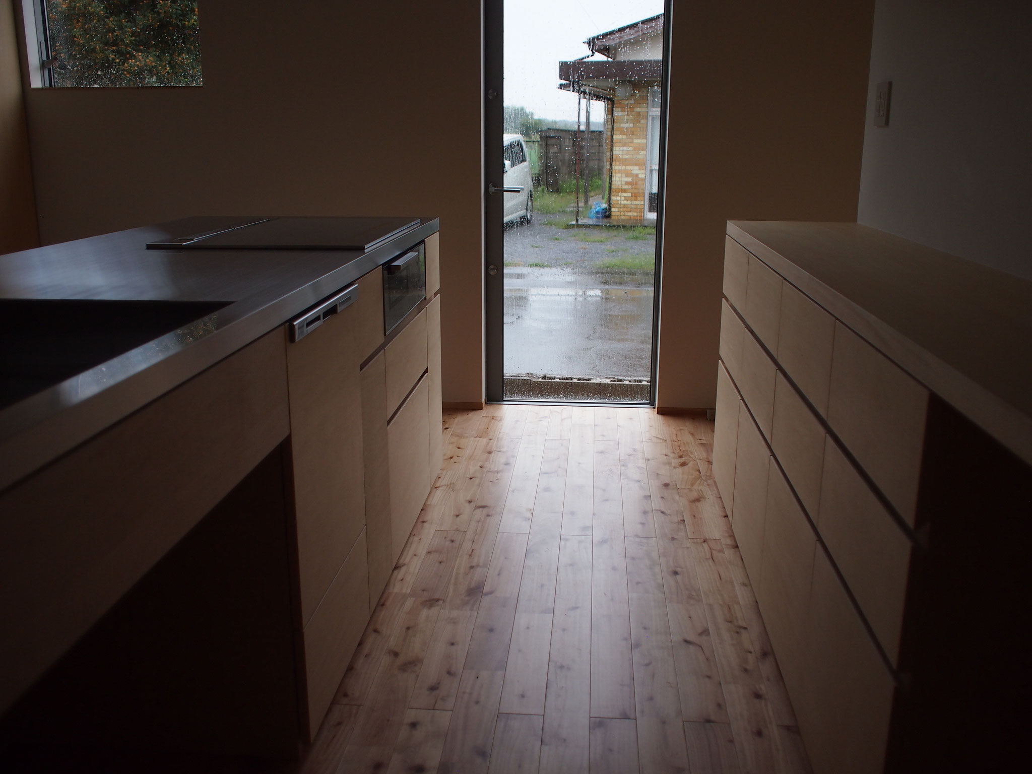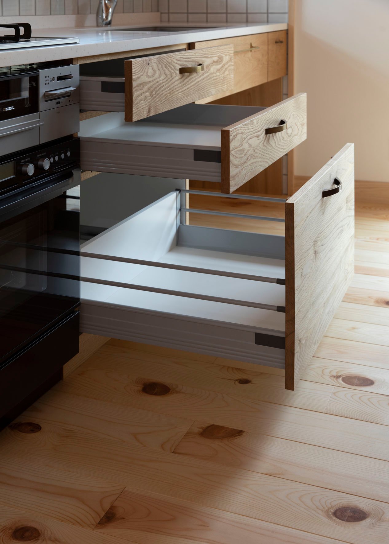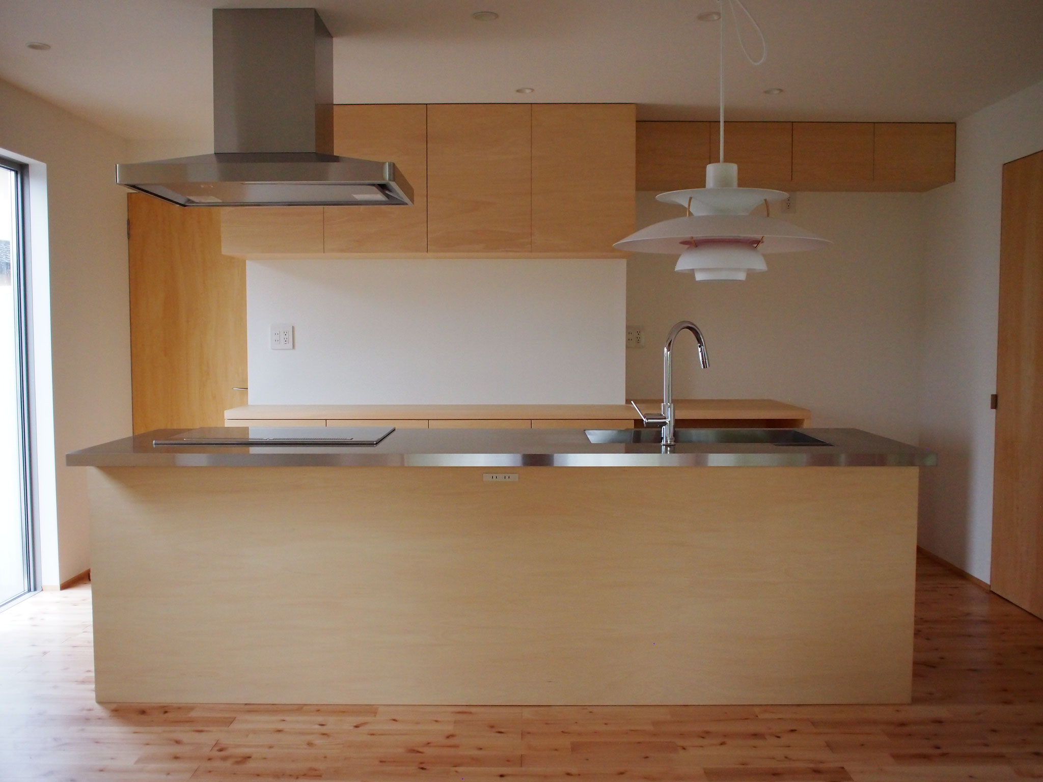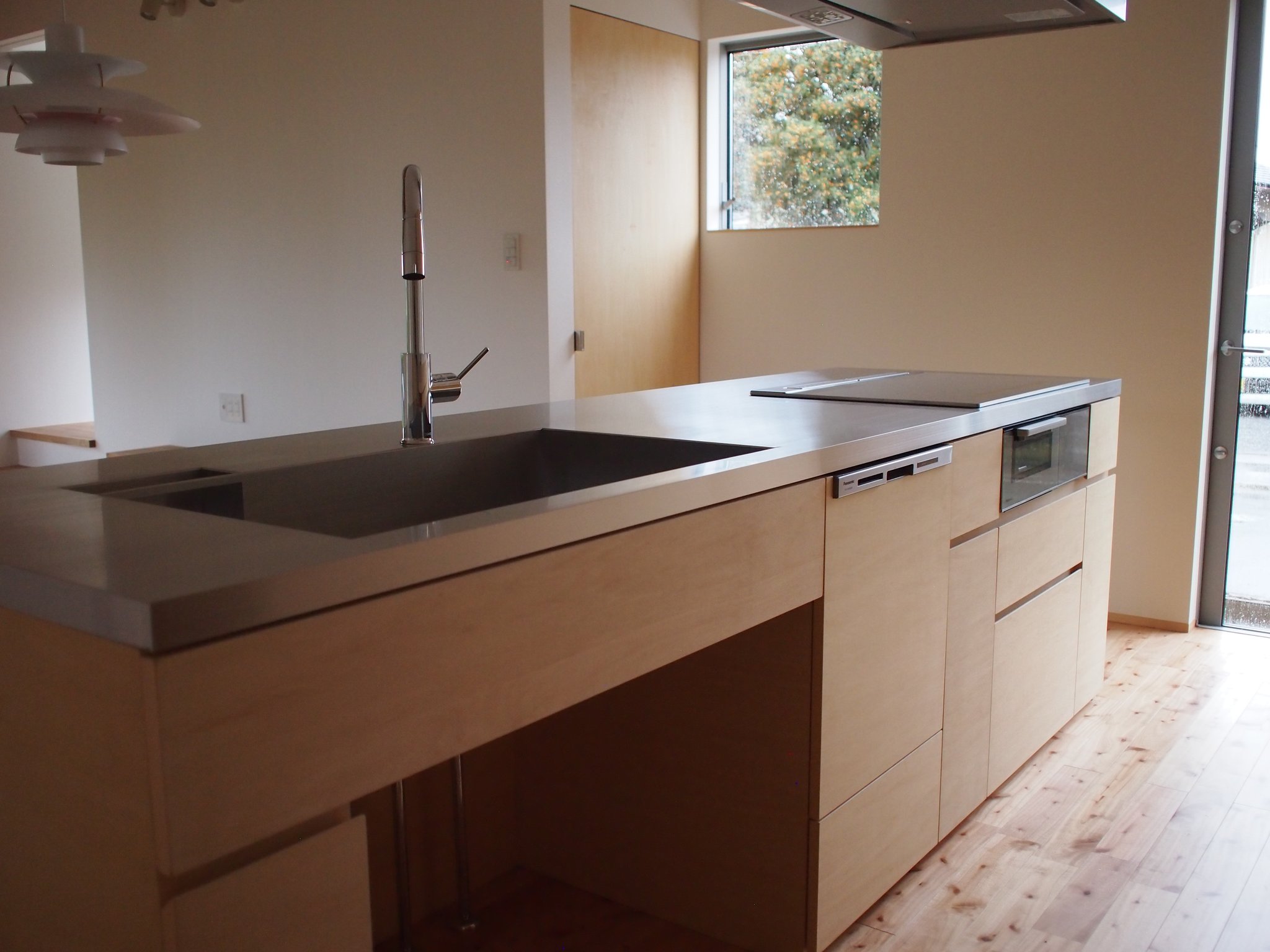 シナベニヤのシンプルな装いに合わせハンドルをつけない構造。包丁ケースを添え付けるなどの機能性もあります。