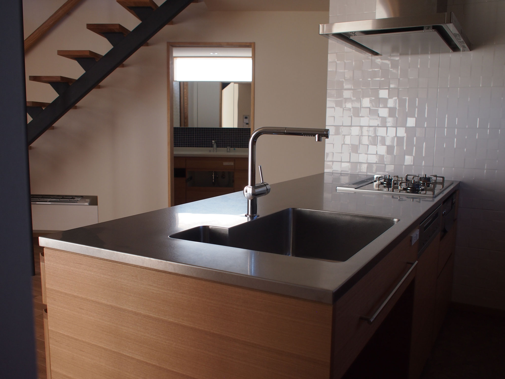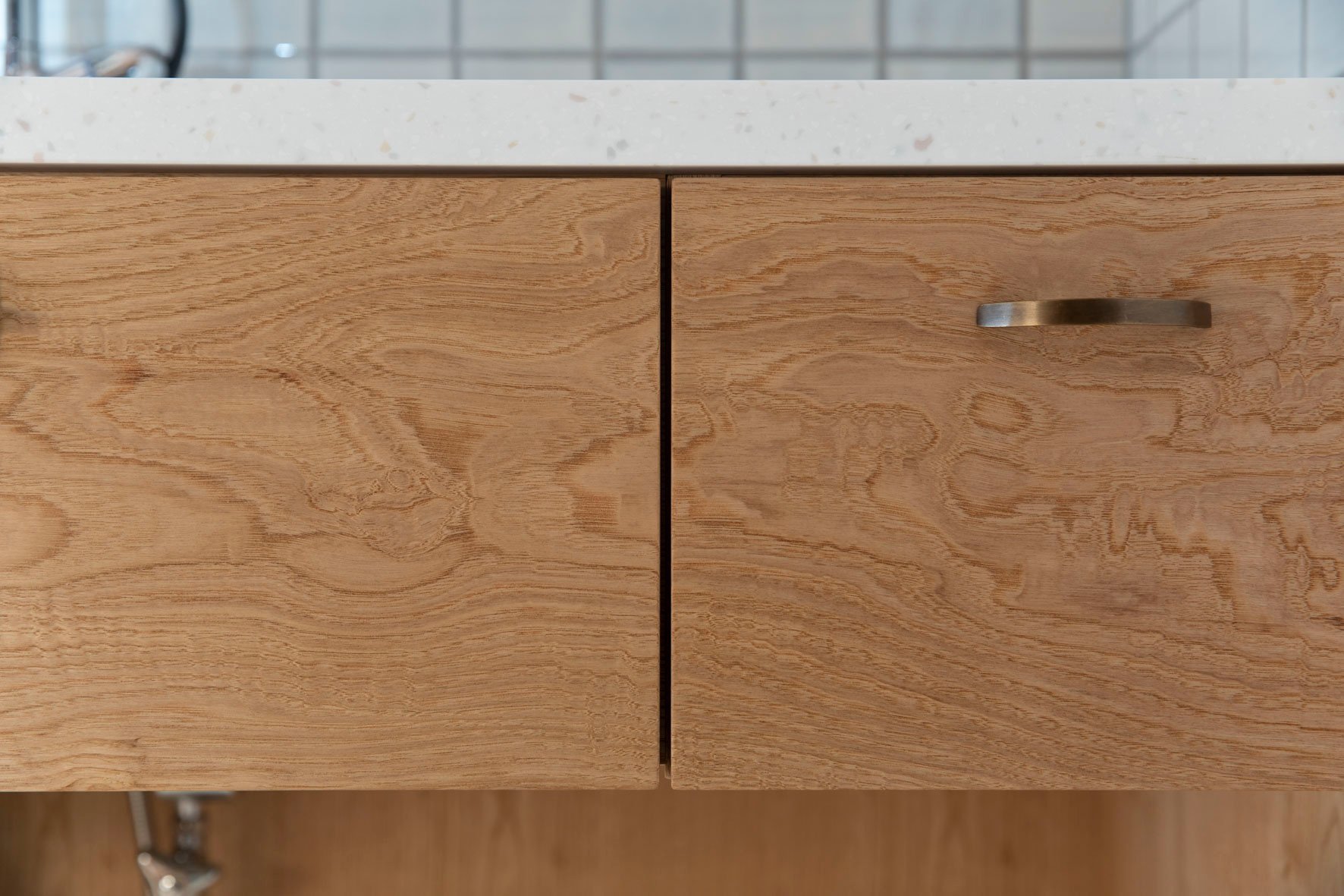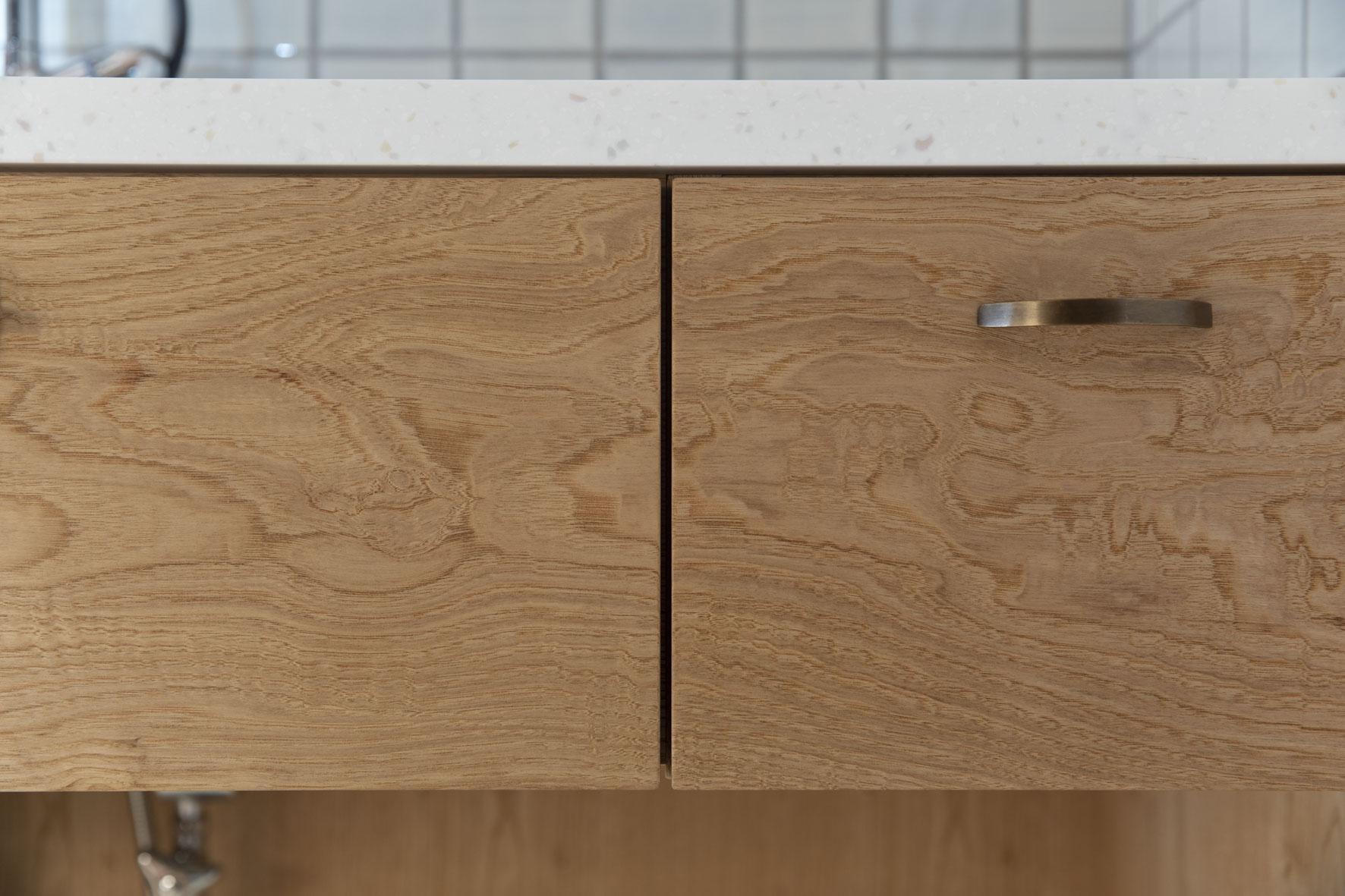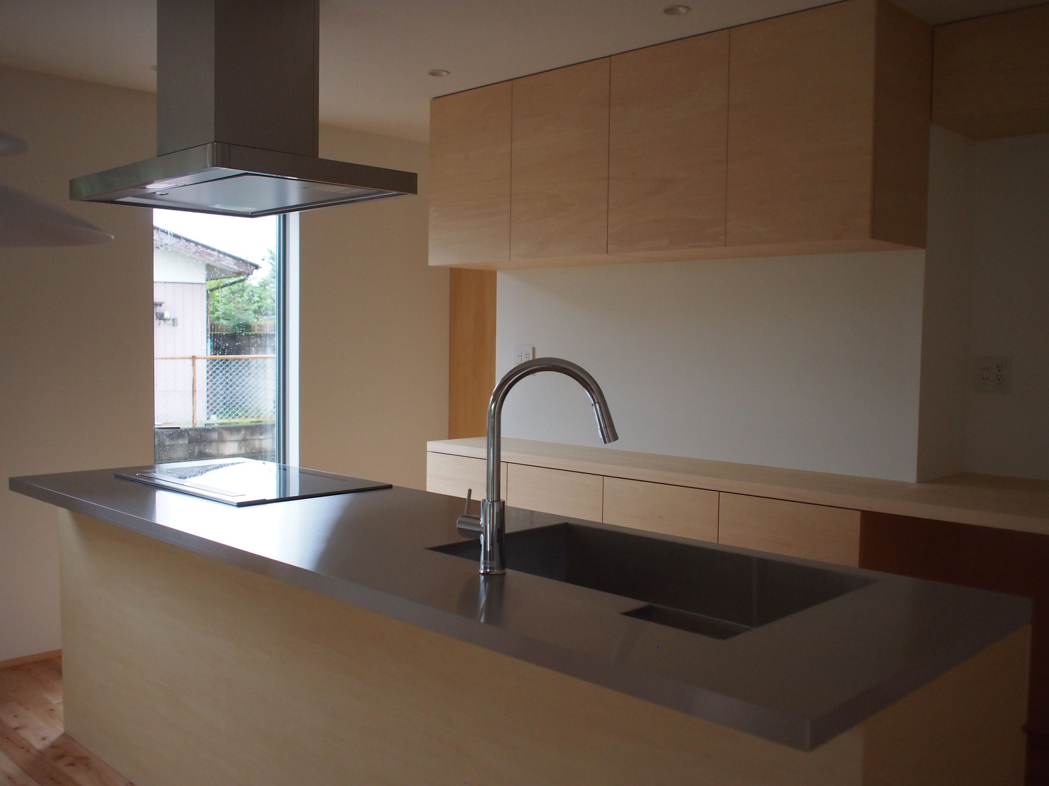 シナベニヤのシンプルな装いに合わせハンドルをつけない構造。包丁ケースを添え付けるなどの機能性もあります。