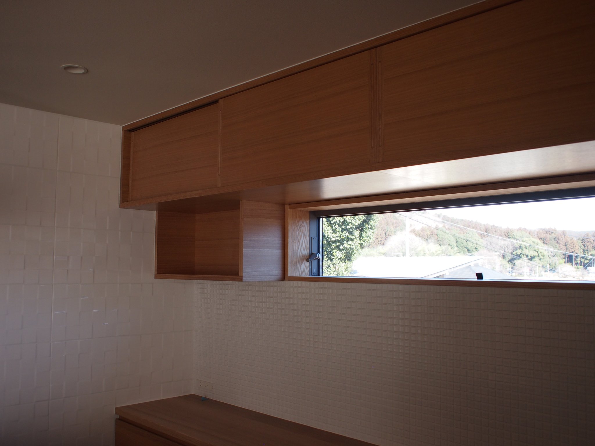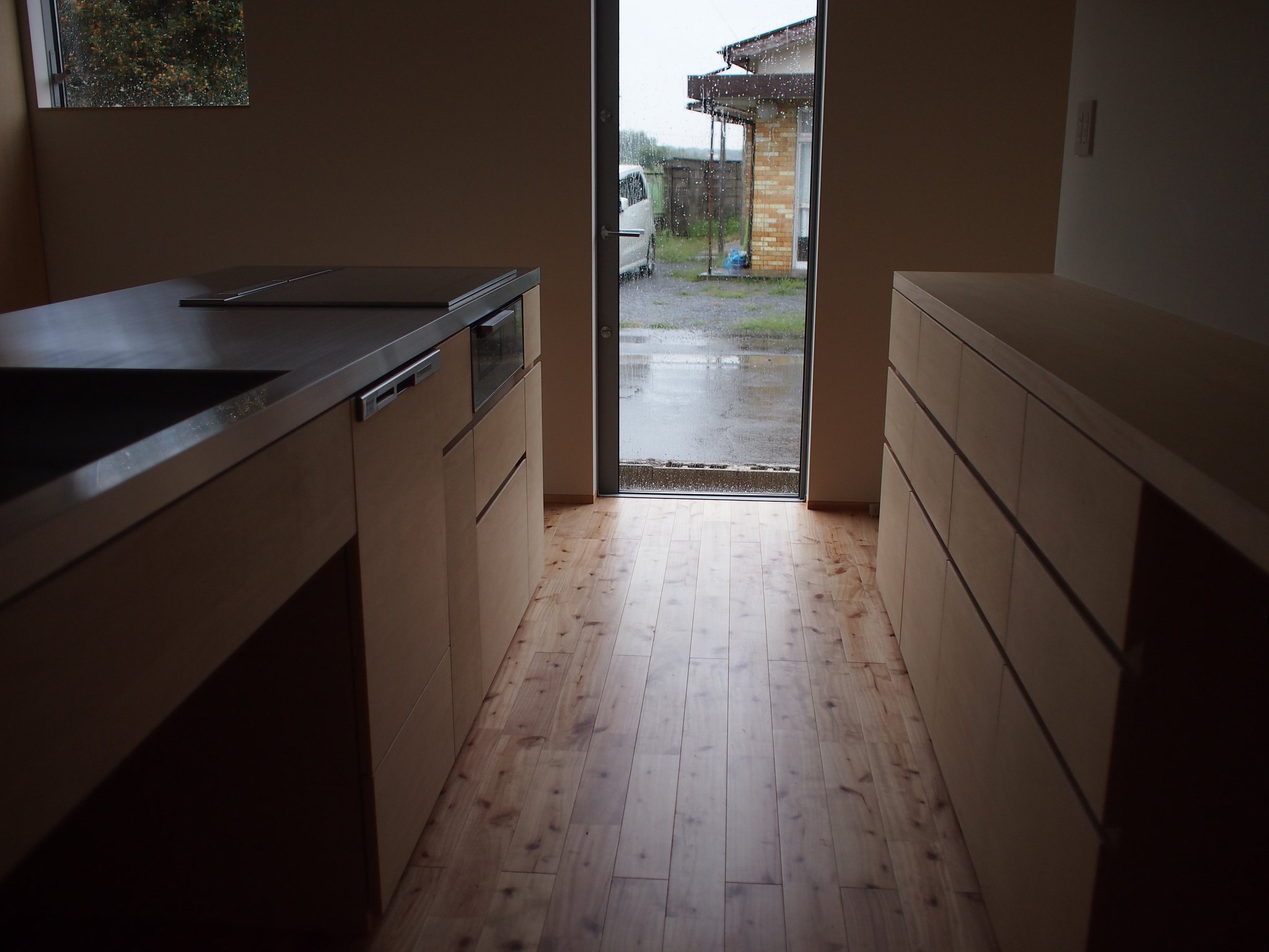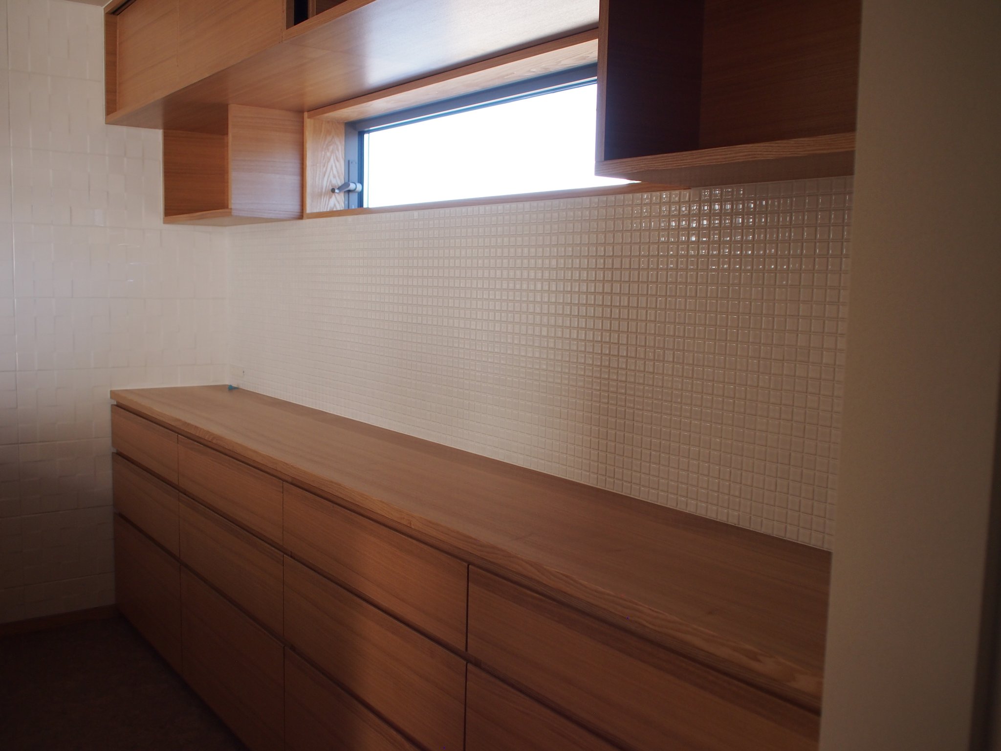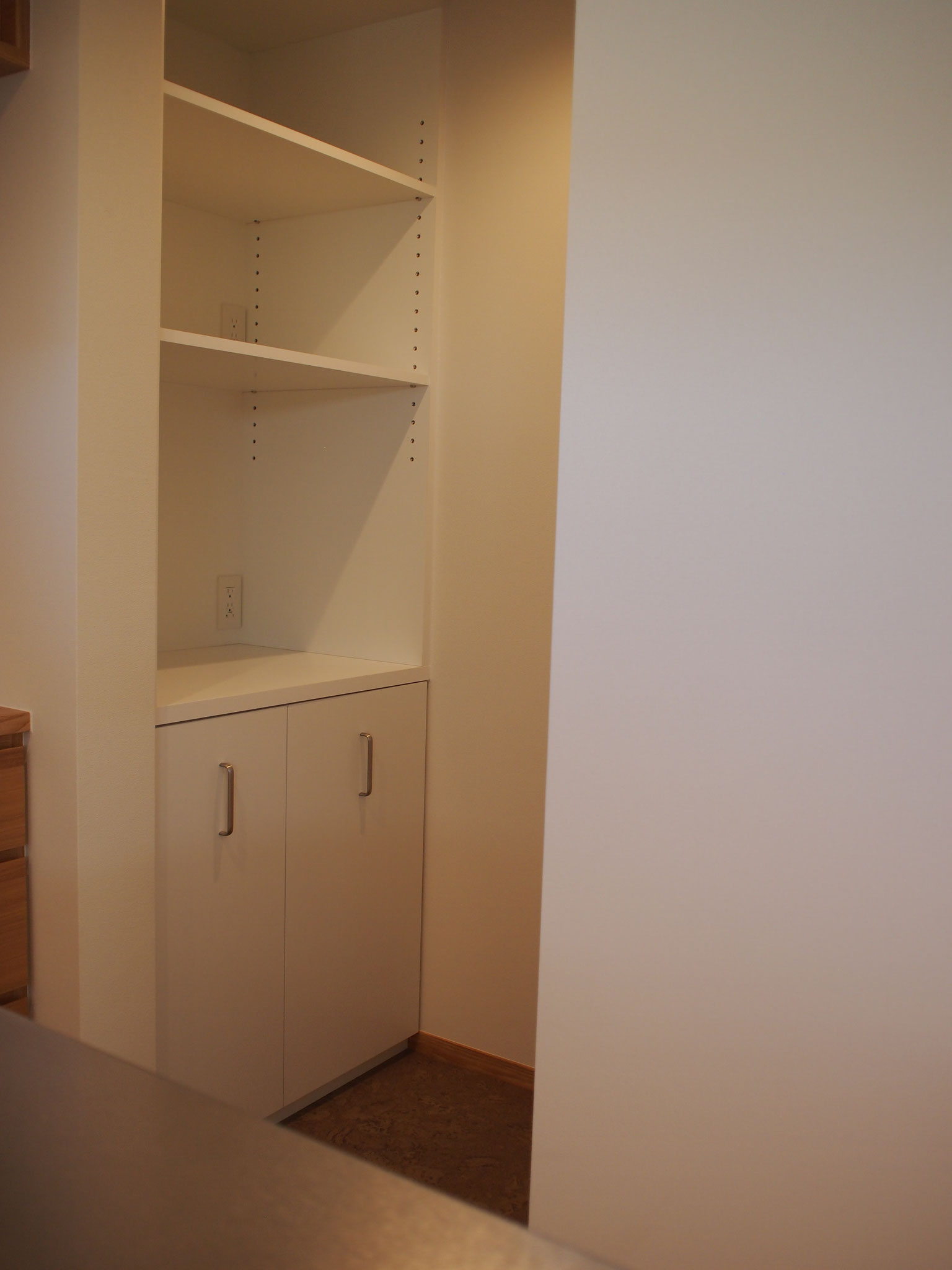 キッチンの奥のパントリーも製作させていただきました。パントリーは、白のポリ合板で製作し深型の籠タイプの引出となっております。