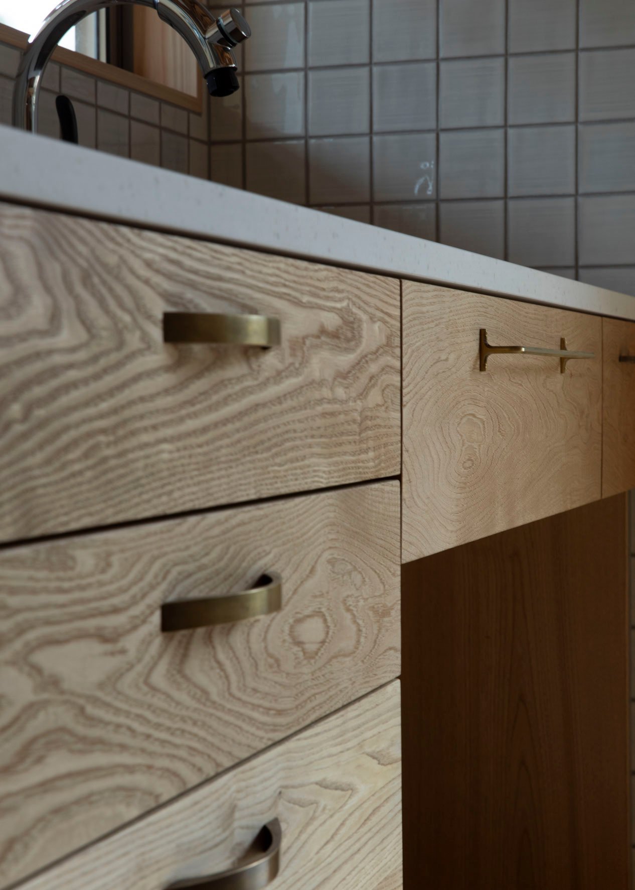 ハンドルは、お施主様が探してきたものをつかい、それにあわせるように真鍮のタオル掛けをつけました。